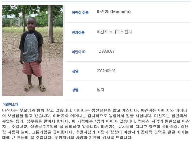 탄자니아의 "마산자"라는 어린아이의 후원을 신청했다.